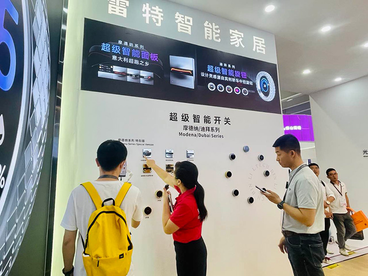 另一系列爆款智能家居“艺术品”,则是今年雷特同期推出的迪拜系列·超级智能旋钮。以360片钻石切割面设计、旋转自带阻尼音效与手感,铸造智能旋钮中的艺术品。更是业内首款蓝牙5.0 SIG Mesh协议的无线带屏幕智能旋钮,让现场来宾爱不惜手!