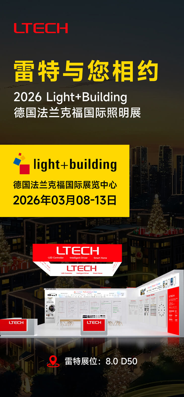 2026 法兰克福国际照明展览会将持续至 3 月 13 日,雷特科技在8.0馆D50 展位继续期待您的莅临,现场不仅有全品类智能照明智控产品的沉浸式体验,更有专业技术团队与商务团队全程坐镇,为您量身定制一站式智能照明解决方案,深度对接全球市场需求!