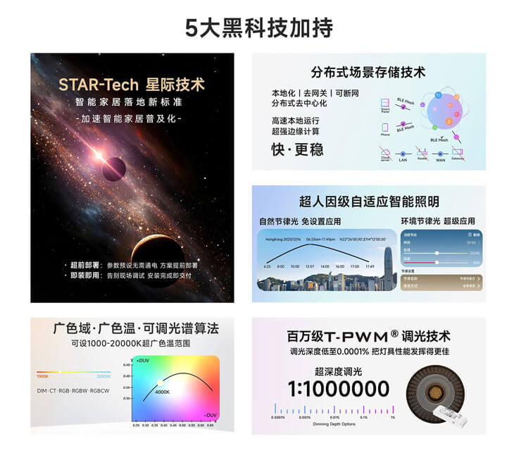 产品的核心竞争力,源于持续创新的技术内核。雷特科技此次展出的全系列产品,搭载雷特5大黑科技——分布式场景存储技术、T-PWM® 百万级超深度调光、RGBCW 广色域广色温可调光谱算法、STAR-Tech 星际技术。