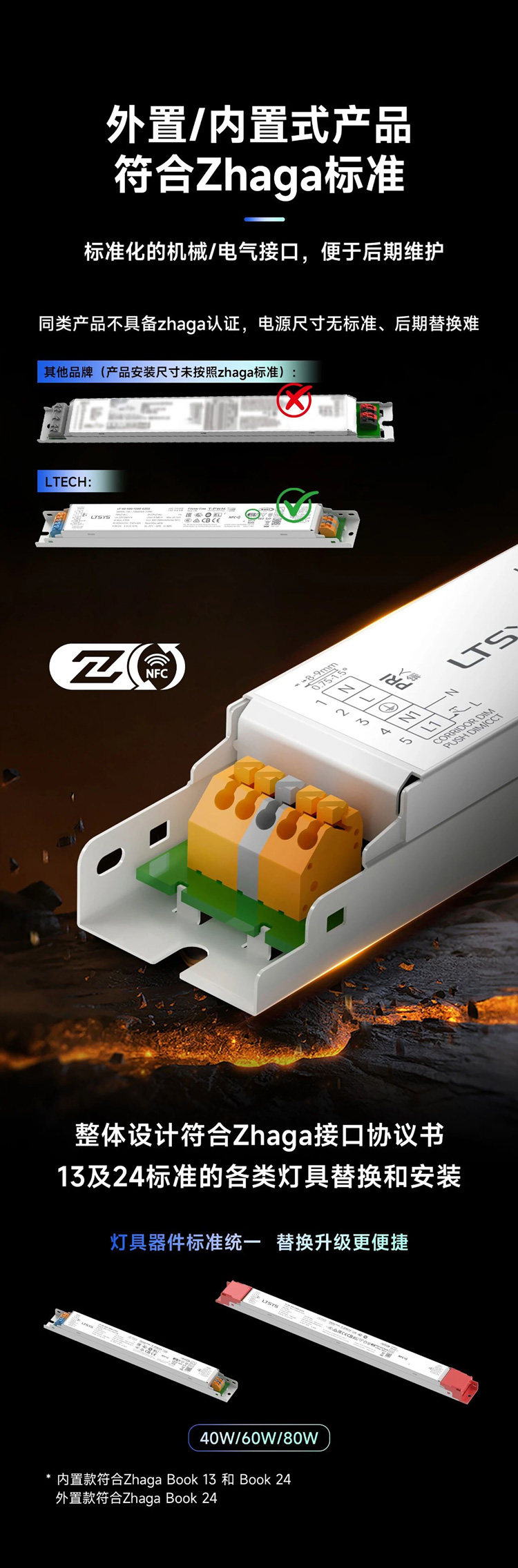 从DALI联盟董事会成员到Zhaga标准践行者,雷特科技始终将 “集体协同” 作为技术发展的核心逻辑。其中,我们推出的LF系列·新一代线性智能照明电源,正是品牌践行标准化理念之作:其整体设计严格符合Zhaga Book 13与Book 24双项标准,适配各类灯具的高效替换与便捷安装。