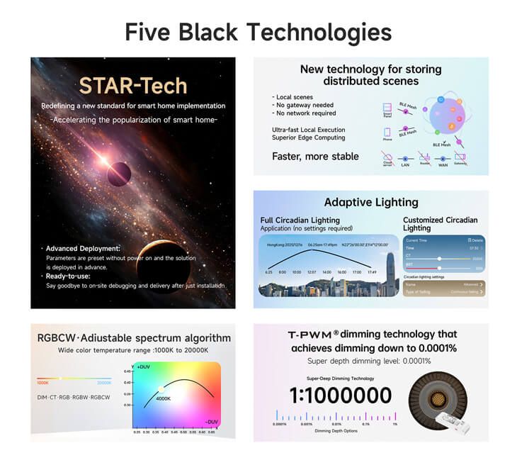 The core competitiveness of the product stems from a continuously innovative technological core. The full range of products showcased by LTECH this time is equipped with Ltech’s five major black technologies — distributed scene storage technology, T-PWM® million-level ultra-deep dimming, RGBCW wide-gamut and wide-color-temperature adjustable spectral algorithm, and STAR-Tech interstellar technology.