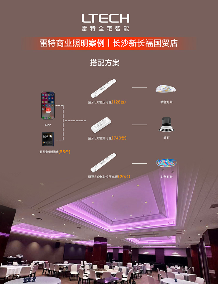 在这样强大的产品硬实力加持下,商用工程执行中便省去了特殊布线的时间和用人成本。仅需一台手机,通过雷特L-Home APP便可以实现对所有蓝牙设备、所有灯效的调试,以更亲民的价格,打造稳定的IoT无线智能系统。大大缩减商用工程的智能系统造价、安装成本,提高效率。