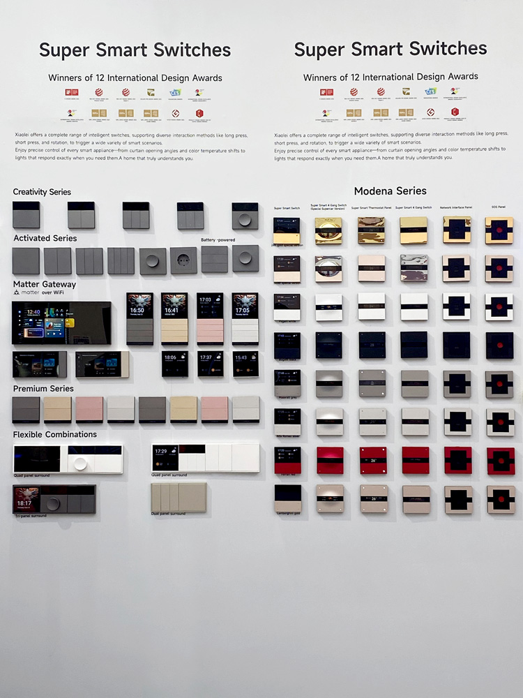 现场吸睛无数的小雷智能家居超级面板系列,揽获12大国际工业设计大奖,重新定义了智能家居美学。其中,取名自意大利超跑之乡的摩德纳超级智能面板、灵感源自宾利轿车中控的迪拜超级智能旋钮,再一次吸引了国际来宾的关注!