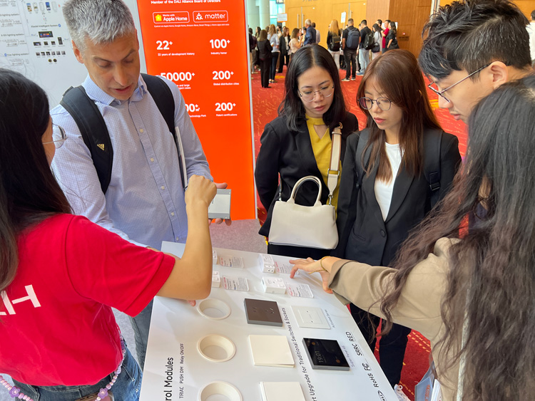 雷特近期上线的新品——K系列智能控制模块,成为了现场争相体验的产品。在体验台旁,来宾们切实体验了K系列的强大功能——不仅能直接装进底盒,更同时可适用于国标86底盒、欧标、美标底盒,通过了UL认证,能够契合各类大型工程的智能改造。让传统开关、复位开关秒变智能。