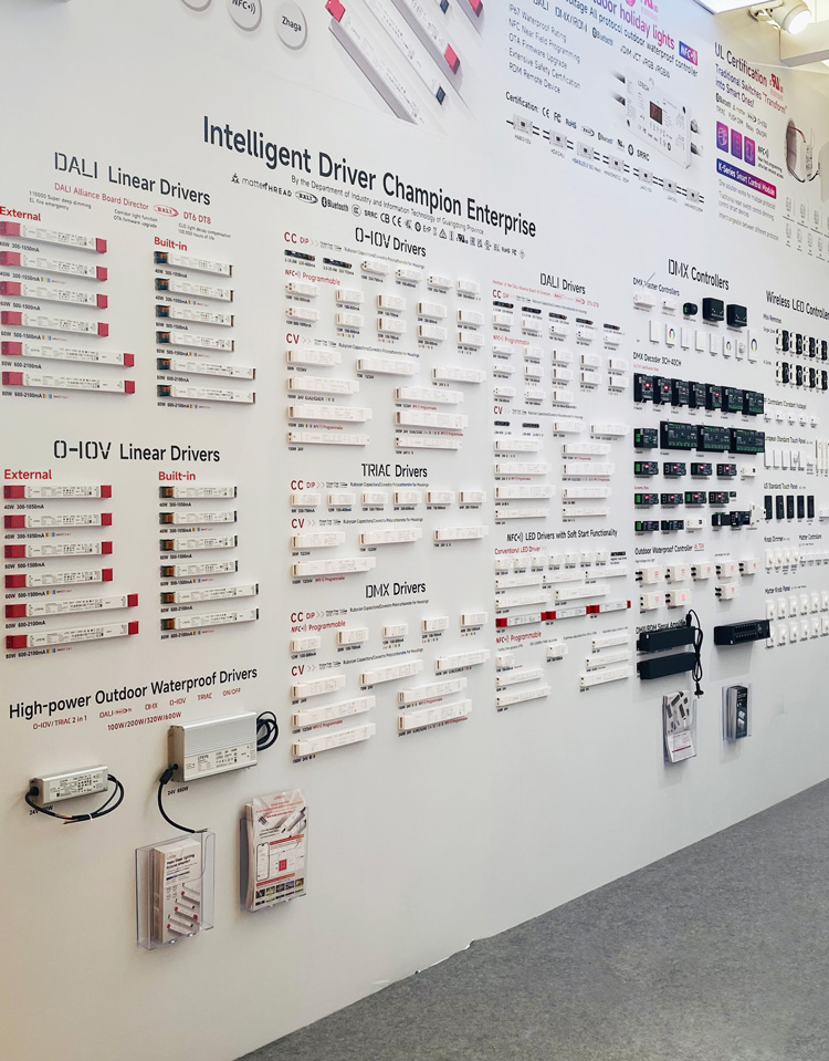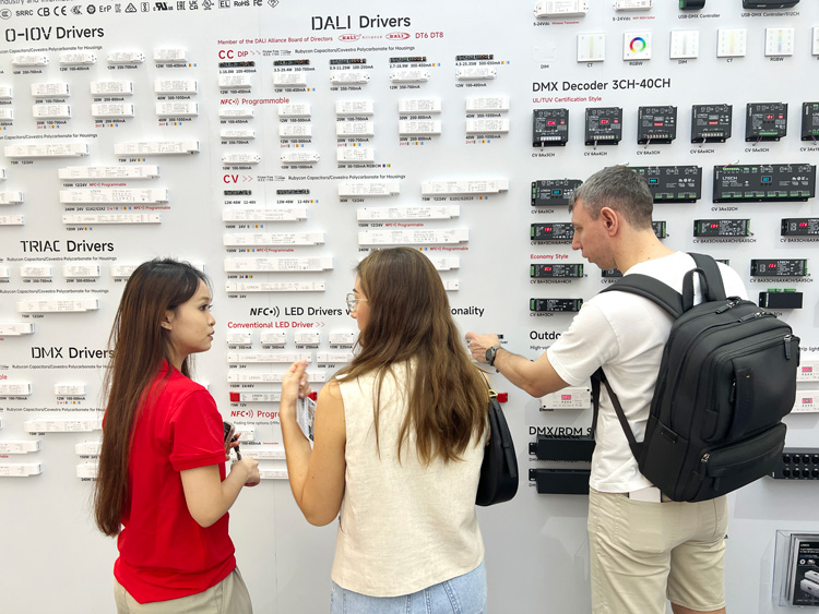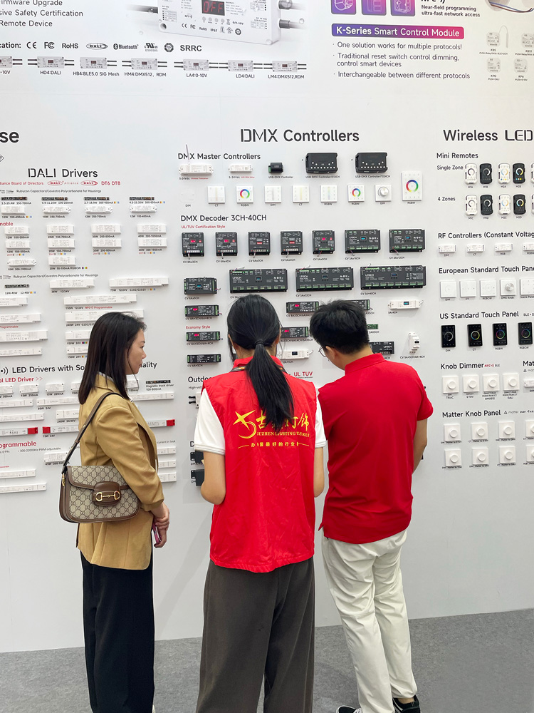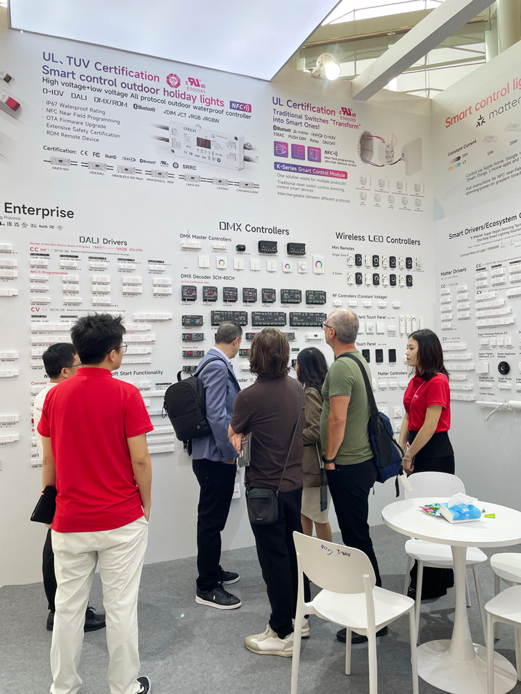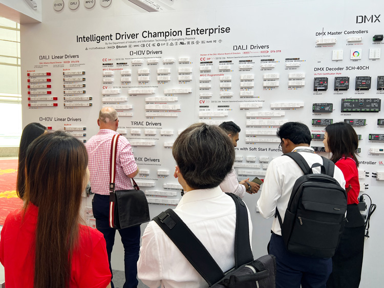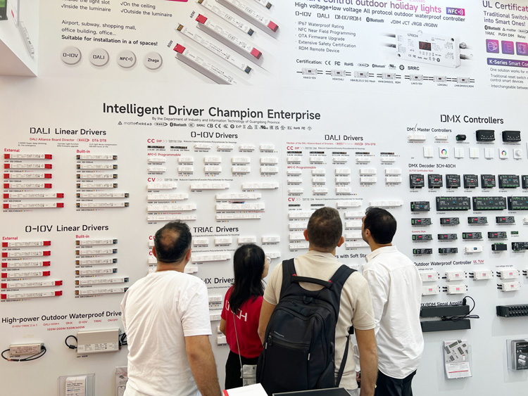 雷特今年推出覆盖DALI/DMX/0-10V/蓝牙全协议的防水控制器矩阵。现场来宾拿起手机贴近高低压防水电源,通过 NFC lighting App 瞬间完成参数编辑,大家纷纷感叹:这将大大提高户外亮化工程的落地效率!