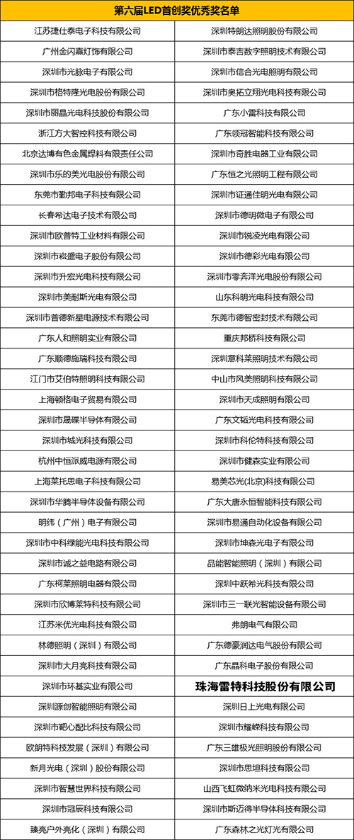 4月21日晚,第六届LED首创奖金奖评审会在中山小榄如期举行,雷特科技在此次评审会中荣获“第六届LED首创奖优秀奖”。中奖名单如下: