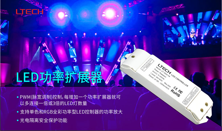 搭配LED功率扩展器可接受PWM控制, 每增加一个功率扩展器就可以多连接一倍或3倍的LED灯数量, 理论上可以连接无限多个功率扩展器。另外,雷特LED功率扩展器信号输入与输出具有光电隔离3KV的安全保护功能,使电视台多种信号灯具得以统一控制并提供优质安全的用光保障。