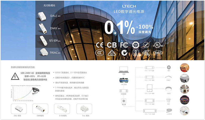 数字化调光电源,无频闪,0.1%调光深度,通过多国权威认证。