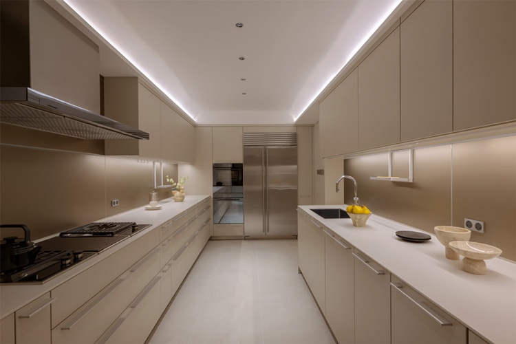 Moving beyond clichéd trends, the designer masterfully integrated the lighting with materials like natural stone, artisanal paint, and parquet flooring. From the living room's skyline-view accent lighting, to the study's soft daylight ambiance, and the dining area's warm atmospheric glow – each play of light and shadow meticulously complements the character of its space.