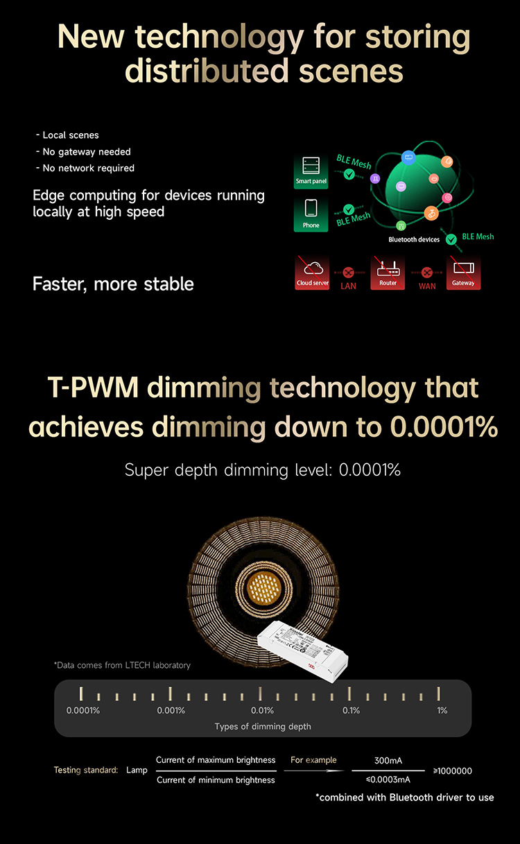 Xiaolei Bluetooth constant current/constant voltage color temperature intelligent power supply is applied in this solution, demonstrating excellent performance. It is equipped with T-PWM® million-level ultra-deep dimming technology, with no stroboscopic effect throughout, reaching the IEEE 1789 high-frequency exemption level, thus creating a true star hotel lighting environment.
