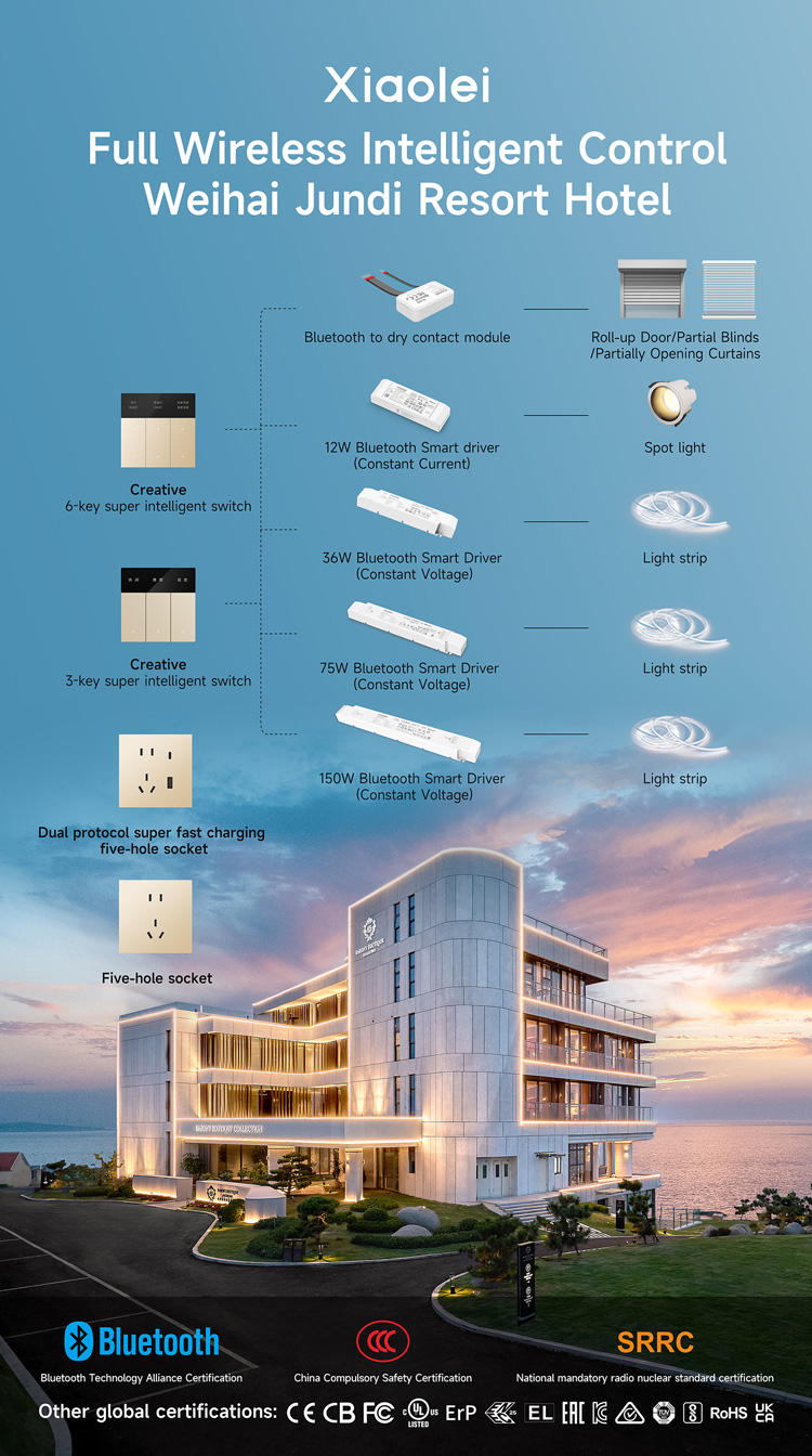 The hotel perfectly integrates the essence of Chinese and Western architecture with the coastal charm of Weihai. The full sea-view suites standing on the cliff are equipped with super-large terraces and 270° full sea-view floor-to-ceiling windows. All rooms adopt Xiaolei Chuangxiang·Super Smart Switches, paired with Bluetooth constant-voltage and constant-current dimming power supplies, and use a fully wireless solution to build a one-stop smart scene for Jundi Hotel.