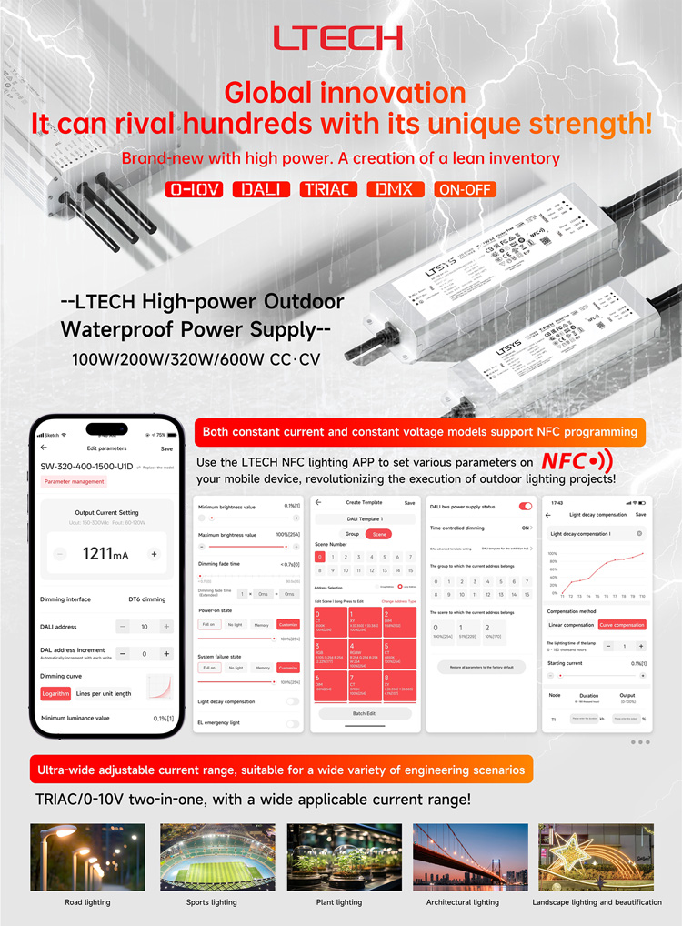 Supported by LTECH Intelligent LED Driver technology, it realizes the requirement of integrating multiple specifications of outdoor waterproof power supplies into one product. It covers a full range of power from 100W to 600W, supports seamless switching between 0-10V and thyristor dual protocols, and is applicable to North American Class I/Division 2 hazardous locations, safeguarding the safety of lighting projects in industries such as fuel and chemical engineering. With the support of NFC near-field programming, whether it is the giant screen lighting of commercial complexes or the long-term lighting of bridges and tunnels, it can be implemented efficiently and safely.