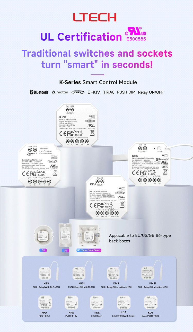The K Series intelligent control module has obtained UL authoritative certification and is compatible with American standard/European standard/national standard junction boxes. Its compact size allows it to be placed into a junction box to realize the intelligent transformation of traditional switches. The module integrates 4 major wired protocols: DALI/DMX/0-10V/triac, as well as Bluetooth 5.0 wireless protocol. It can be connected to open ecosystems such as Apple Home and Matter. Traditional switches and reset switches can also achieve dimming and device control functions.