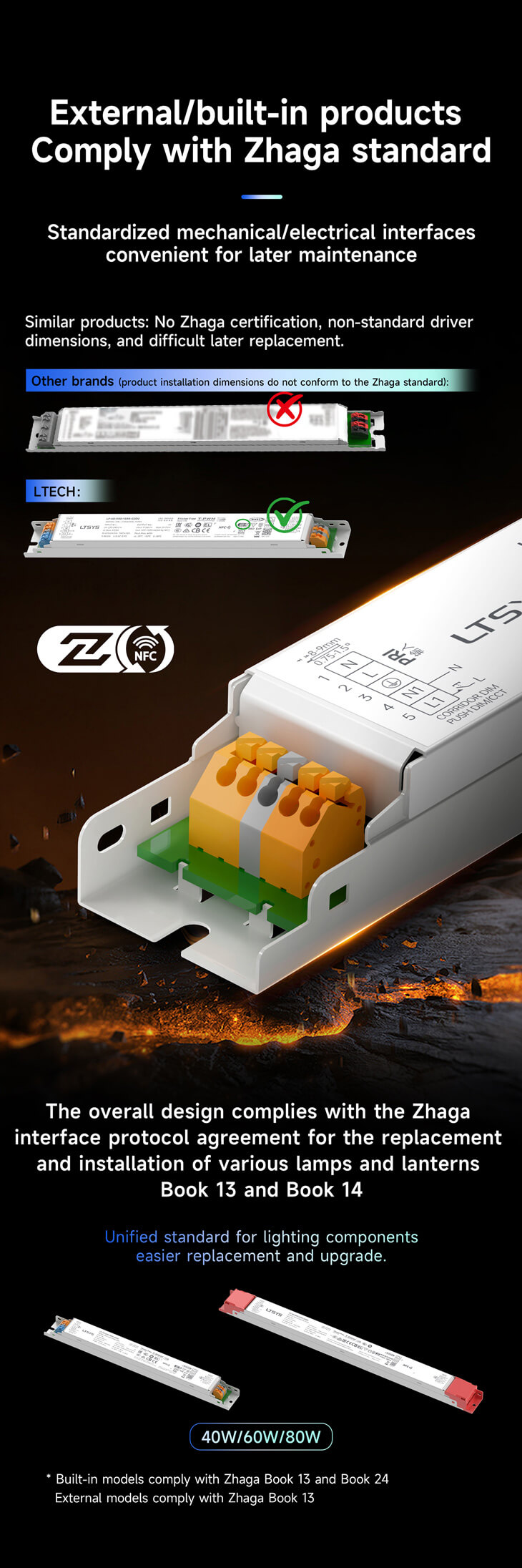 LF Series Linear Intelligent LED Drivers,Exclusively engineered for linear lighting fixtures.We offer two product lines: built-in and external versions,The overall design strictly complies with Zhaga Book 13 & Book 24 standards,enabling efficient replacement and easy installation for all types of lighting fixtures,Ideal for commercial applications including office buildings shopping malls and more.This series has obtained multiple authoritative certifications:TÜV, China CCC,as well as ENEC/CE/EL/CB (issued by German TÜV),and international certifications such as RoHS & EAC.A smart and optimal solution for office lighting projects.