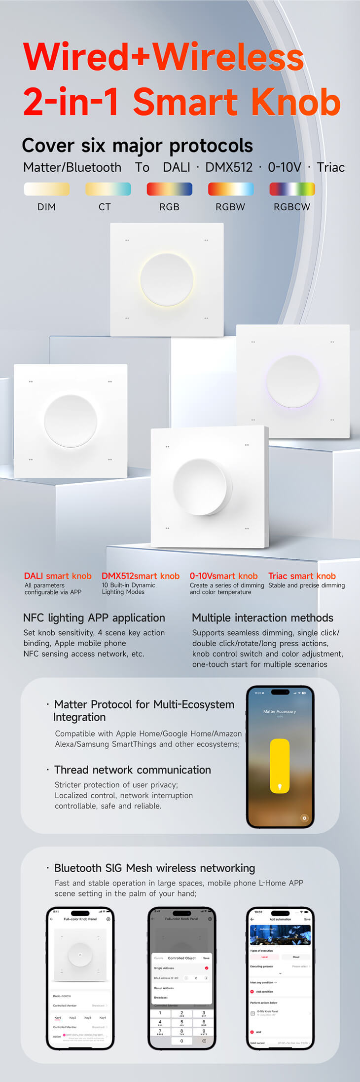 The series of knob products integrate DMX, 0-10V, DALI, and TRIAC four wired protocols making intelligent control of various lighting projects more convenient.Two major series are designed: Matter-to-wired protocol and Bluetooth-to-wired protocol.Compatible with the global Matter protocol ecosystem platforms such as Apple Home, Google Home, Amazon Alexa,Samsung SmartThings and L-Home.The knob supports stepless dimming and diverse interactions including single-click, double-click, rotation, and long press.Four scene keys enable quick access to a wide range of lighting effects.
