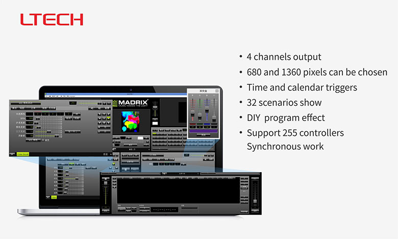 Super recording, synchronization offline. Artnet software need charge of abroad, and the software can only be used on a project, LTECH Artnet-SPI controller system with recording function, is not limited to software bunding pricing, can be compatible with Artnet lighting control software of protocol. Offline synchronization is not required to specity a master slave, and the progarm recording is not restricted by the file format. One set of software can be used for various lighting scenes, which greatly reduces cost of lighting project.